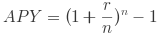APY= (1 + r/n )^n – 1, In which: r = interest rate n = number of compounding periods. If you deposit for one year at 5% interest and your deposit was compounded monthly, the APY would be (1 + 0.05/12 )^12 – 1 = 0.051162 = 5.1162%